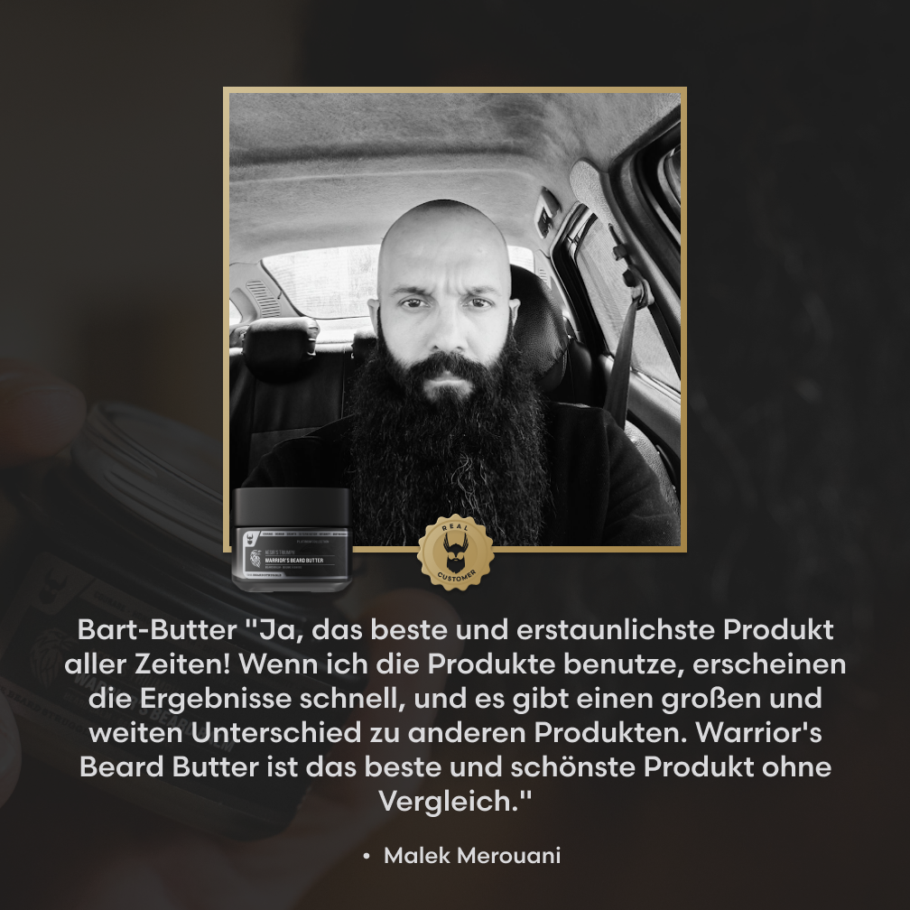 Tauche ein in das Geheimnis eines seidig-weichen und optimal mit Feuchtigkeit versorgten Bartes mit unserer verbesserten Warrior's Bartbutter. Entwickelt, um herkömmliche Balsame zu übertreffen, ist unsere Formel reich an natürlichen Ölen und Butter, die deinem Bart unübertroffene Feuchtigkeit und Stärke verleihen.